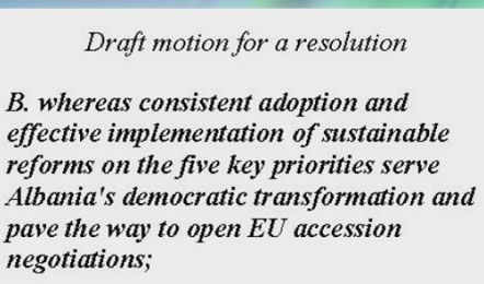 “Hapja e negociatave të anëtarësimit do të ishte një nxitje dhe do të zhvillonte më tej reformat, duke ofruar një perspektivë të besueshme dhe të prekshme të BE-së”, theksohet fillimisht në këtë projekt-dokument. Por, “suksesi i axhendës së reformave varet fuqishëm nga ekzistenca e një mjedisi politik demokratik”, thuhet më tej, duke kërkuar nga mazhoranca dhe opozita që të ushtrojnë plotësisht përgjegjësitë e tyre politike dhe të jenë në gjendje për të pranuar kompromise, çfarë do të rriste besimin e qytetarëve tek institucionet publike.