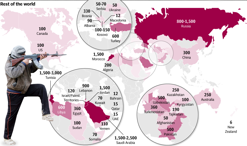 Vendi që ka kontribuar më shumë është Tunizia me më shumë se 3000 luftëtarë që i janë bashkuar ISIS-it. Ndërsa në vendin e dytë është Arabia Saudite, me mbi 2500 luftëtarë.
