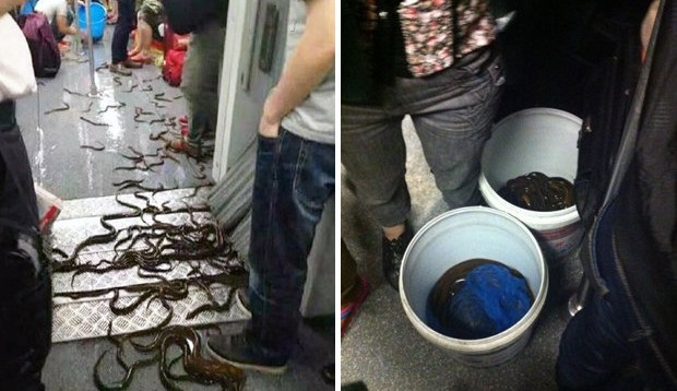 Një udhëtar derdhi pa dashje një kovë plot me ngjala ndërsa udhëtonte me metronë e Shangait. Të gjitha të gjalla u shpërndanë në vagonat e metrosë duke tmerruar ata që ndërkohë po udhëtonin me të njëjtën linjë. Ngjalat kanë lëvizur nga vendi ku kanë rënë, duke u shpërndarë kështu nëpër këmbët e udhëtarëve që ishin në metro, raporton dailystar.