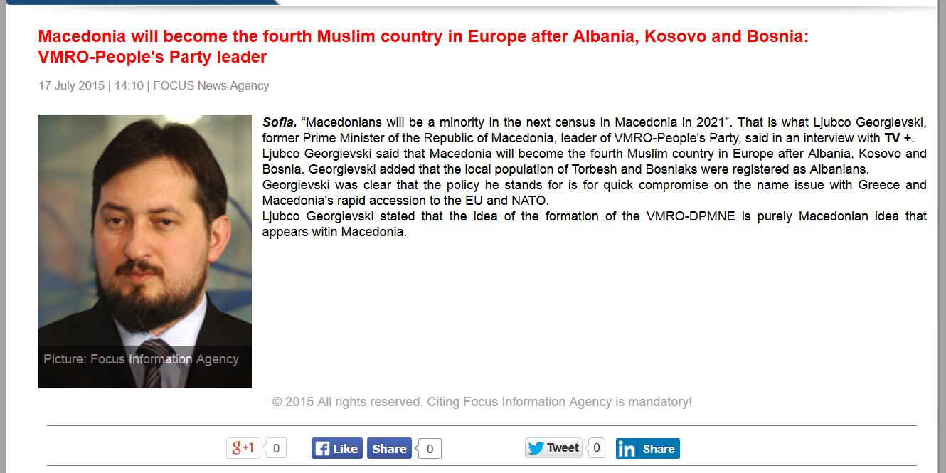 Georgievski tha se Maqedonia do të bëhet vendi i katërt mysliman në Evropë, pas Shqipërisë, Kosovës dhe Bosnjës, transmeton sot “Focus News Agency”