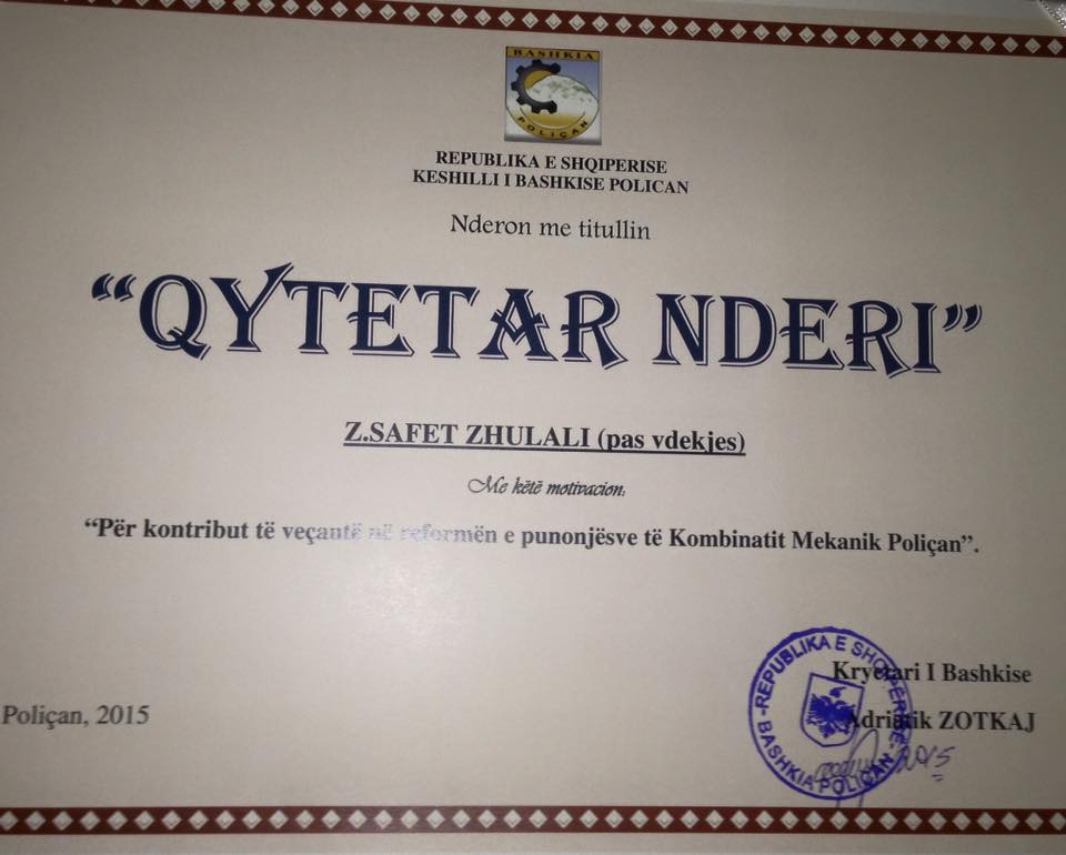 Titllu iu dha me motivacionin “Për kontribut të vecantë në reformën e punonjësve të Kombinatit Mekanik, Polican”.