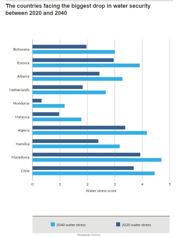Ndër vendet që pritet të shohin rritjet më të mëdha në mungesën e ujit janë Botsvana dhe Estonia, që mbajnë vendet e para, dhe pas tyre renditet Shqipëria.