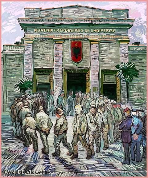 Piktori e hodhi në fb veprën e tij frymëzuar nga piktura “Të burgosurit” të Vincent van Gogh, më 5 shtator të këtij viti. Ajo plotësohet me një pamje nga Parlamenti shqiptar. Piktura u shoqërua me postimin e mëposhtëm: