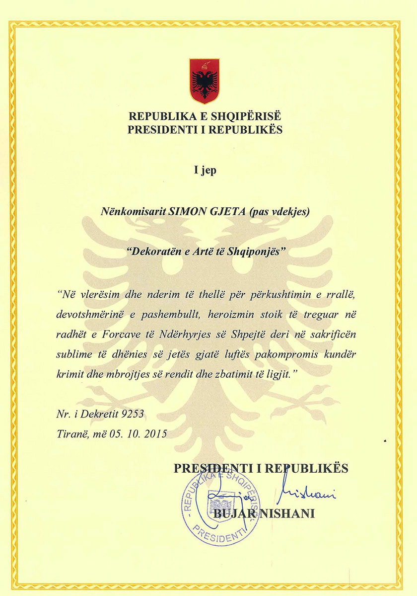 Presidenti i Republikës, Bujar Nishani vlerësoi sot Nënkomisarin Simon Gjeta (pas vdekjes) me “Dekoratën e Artë të Shqiponjës” me motivacionin, “Në vlerësim dhe nderim të thellë për përkushtimin e rrallë, devotshmërinë e pashembullt, heroizmin stoik të treguar në radhët e Forcave të Ndërhyrjes së Shpejtë deri në sakrificën sublime të dhënies së jetës gjatë luftës pakompromis kundër krimit dhe mbrojtjes së rendit dhe zbatimit të ligjit.”