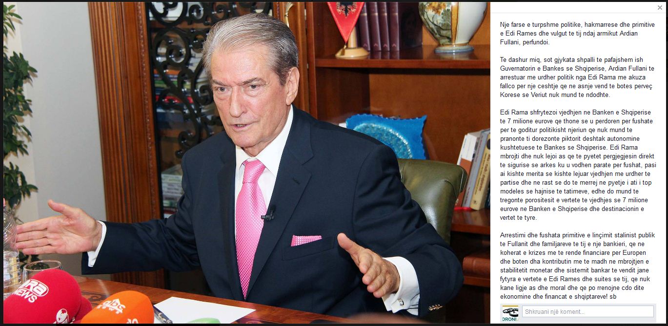 Arrestimi dhe fushata primitive e linçimit stalinist publik te Fullanit dhe familjareve te tij e nje bankieri, qe ne koherat e krizes me te rende financiare per Europen dhe boten dha kontributin me te madh ne mbrojtjen e stabilitetit monetar dhe sistemit bankar te vendit jane fytyra e vertete e Edi Rames dhe suites se tij, qe nuk kane ligje as dhe moral dhe qe po rrenojne cdo dite ekonomine dhe financat e shqiptareve!”.