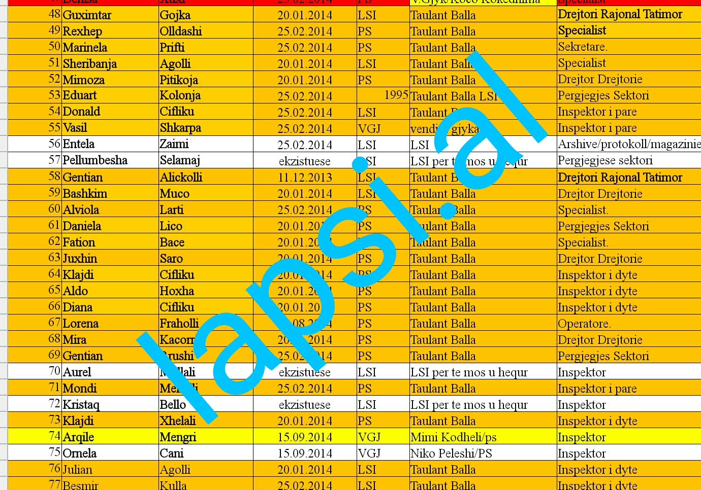 Dokumenti është një listë e Drejtorisë së Tatimeve, ku sikurse ironizon lapsi.al, “vajza që po sakrifikon për të bërë shtet” rekruton me urdhër partie. Në atë listë gjenden plot 372 vetë të “mbështetur” nga deputetë socialistë e lësëistë. Natyrisht ashtu sikurse pritej numrin më të madh të emërimeve e ka bërë Flamuri i PS-së, Taulant Balla me plot 80 emërime. Pas tij vjen LSI-a me 62 të tilla, kreu i bashkisë Durrësit që pasi ka kapur OSSHE-në ka sugjeruar 13 emërime dhe Koço Kokëdhima me 8 të tilla.