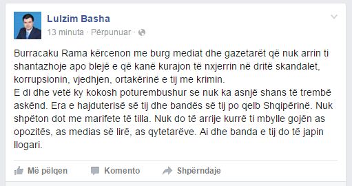 E di dhe vete ky kokosh poturembushur se nuk ka asnjë shans të trembë askënd. Era e hajdutërisë së tij dhe bandës së tij po qelb Shqipërinë. Nuk shpëton dot me marifete të tilla. Nuk do të arrijë kurrë t’i mbyllë gojën as opozitës, as medias së lirë as qytetarëve. Ai dhe banda e tij do të japin llogari”, deklaron Basha.