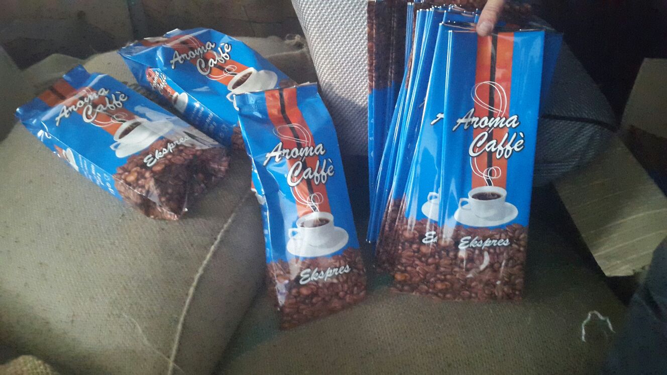 • tre qese ngjyrë blu të mbushura me kafe kokërr e pjekur;