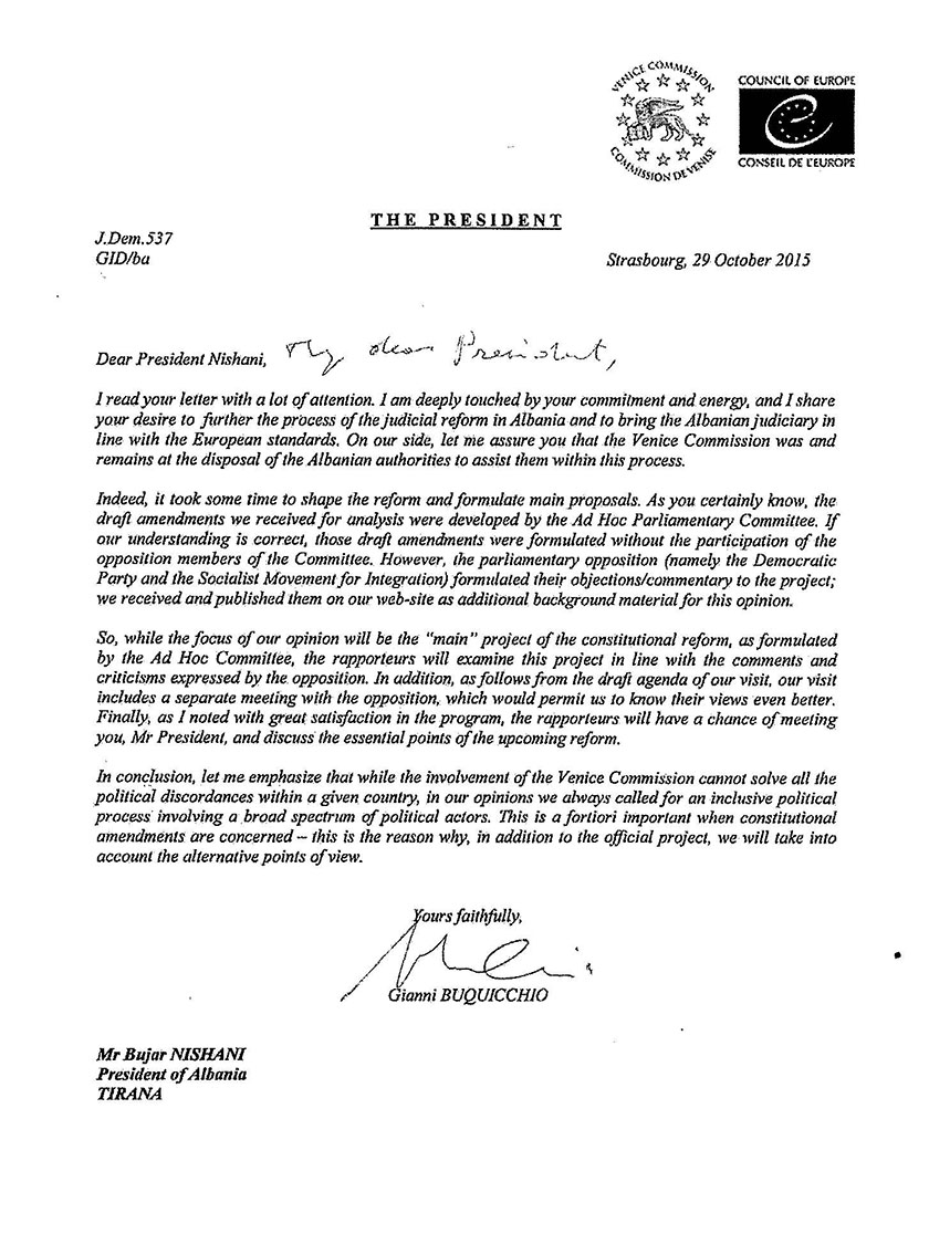 Presidenti i Republikës, Bujar Nishani ka marrë një letër mbi reformën në drejtësi nga Presidenti i Komisionit të Venecias, Gianni Buquicchio në të cilën shkruhet: