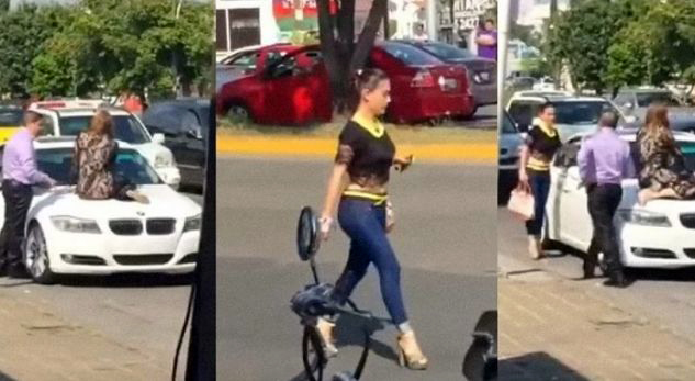 Gruaja duket e kishte ndjekur burrin derisa ai takohet me dashnoren e tij, të cilën ai e fut në veturë, pas së cilës ka reaguar shpejt, duke hipur mbi pjesën e përparme të veturës, duke mos lejuar që ai të largohej me dashnoren e tij.