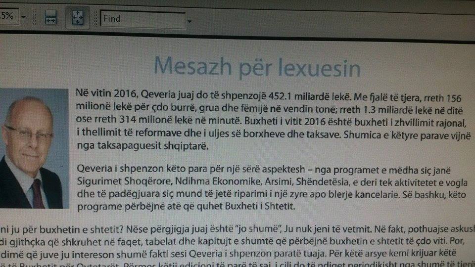 “Ne vitin 2016, Qeveria juaj do te shpenzoje 452.1 miliarde leke. Me fjale te tjera, rreth 156 milione leke per cdo burre, grua dhe femije ne vendin tone,”-thote ne fjalen bashkangjitur dokumentit Ministri i Financave.