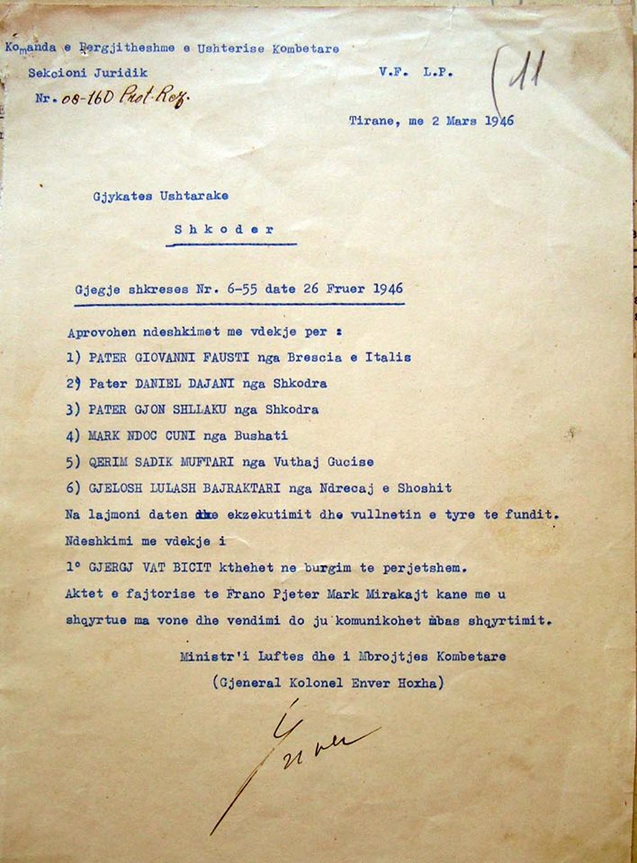 Në vijim të postimit të tij, Dervishi ka publikuar një urdhër ekzekutimi firmosur nga vetë Enver Hoxha në vitin 1946.