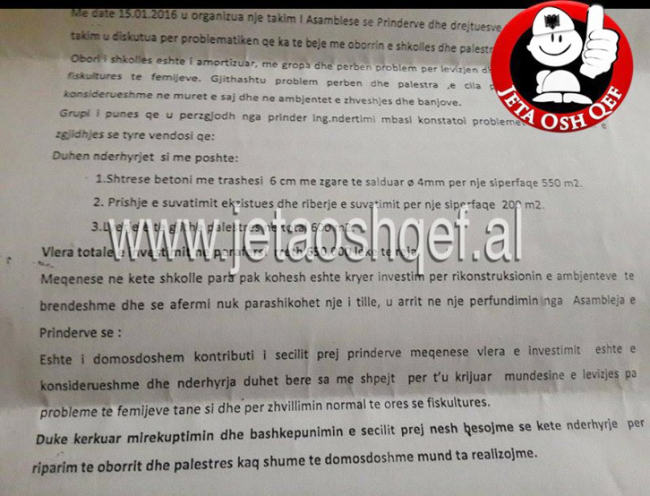 “Jam 1 prind që kam 2 fëmijë në klasë të parë ke 1 shkollë 9-vjeçare në Durrës. Thjesht për ndërgjegjësim të opinionin publik po ju dërgoj këtë foto të 1 dok ku duhet të kontribuojmë për riparimin e oborrit dhe të palestrës së shkollës që janë bërë copë copë mu në mes të Durrësit. S’po e them emrin e shkollës se në do kontribuojmë për të gjithë fëmijët tanë dhe 10 apo 20 mijë lek të vjetra, por është turp që qeveria Rama vjedh dhe nuk investon në arsim, ky është turp dhe krim që bëhet ndaj brezave e fëmijëve tanë”.