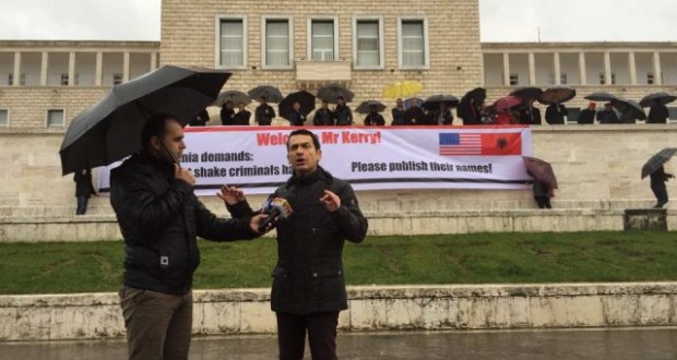Dhjetra aktivistë “kuqezi”, kanë vendosur një banderolë për ardhjen e sekretarit Kerry në Shqipëri.