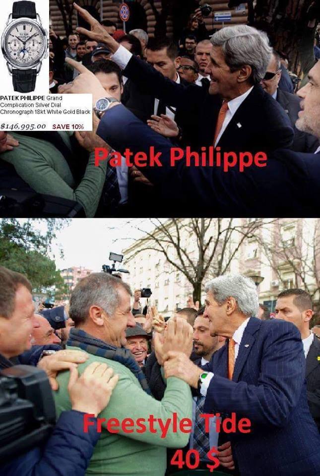 Nje foto ndërsa Sekretari Kerri po takonte qytetarët të grumbulluar para Kryeministrisë ka mjaftuar që sy të vëmendshëm në rrjetet sociale të bënin një krahasim të orëve që mbanin në duar Kryeministri Rama dhe Sekretari Kerri.