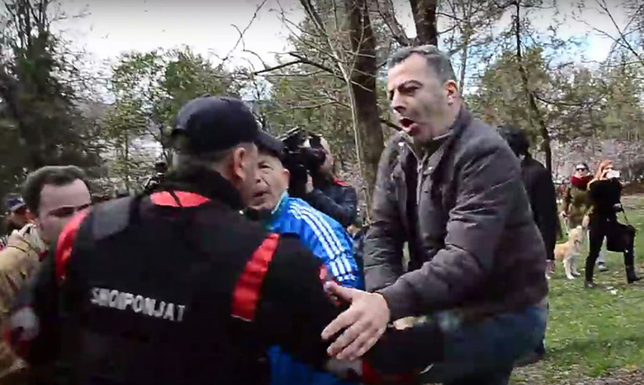 Në këtë video, një efektiv i Forcave Shqiponja që po përplaset me aktivistin Eljan Tanini, ndërsa një tjetër qytetar shkon t’i ndajë, efektivi i gjuan me grusht.