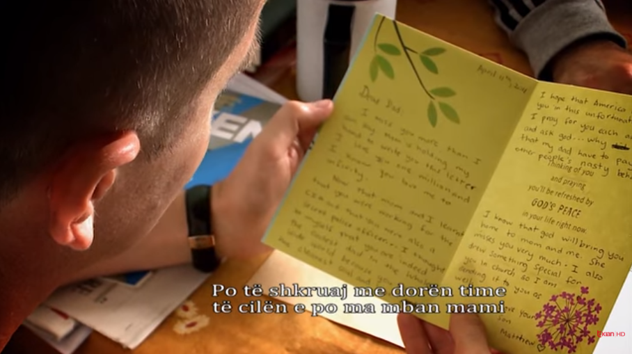 I dashur babi! Më mungon aq shumë sa nuk e them dot me fjalë. Po të shkruaj me dorën time të cilën po ma mban mami. Një milionë herë të dua sepse e di që dhe ti më do pafund. Tani që unë dhe mami mësuam që ti punon si oficer i CIA –s dhe duke e ditur që ke qenë gjithashtu një agjent sekret mendova me vete se ti vërtetë je babai më fantastik në botë sepse ti ke shpirtin dhe zemrën më të pastër. E di që Zoti një ditë do të të sjellë në shtëpi tek mua dhe mami. Mami e ndjen mungesën tëndë pamasë. Kur vajtëm në kishë vizatova diçka vetëm për ty dhe po ta nis. Të dua shumë, yt bir Mathew.