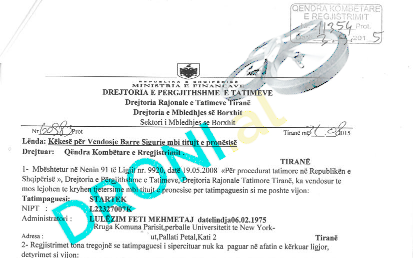 Sipas kësaj shkrese, Drejtoria e Përgjithshme e Tatimeve, saktësisht sektori i Mbledhjes së Borxhit, të Drejtorisë së Mbledhjes së Borxhit, në drejtorinë Rajonale të Tatimeve të Tiranës, i kërkon Qendrës Kombëtare të Regjistrimit (QKR-së) “vendosje barre sigurie mbi titujt e pronësisë”, ndaj kompanisë “Startek”.