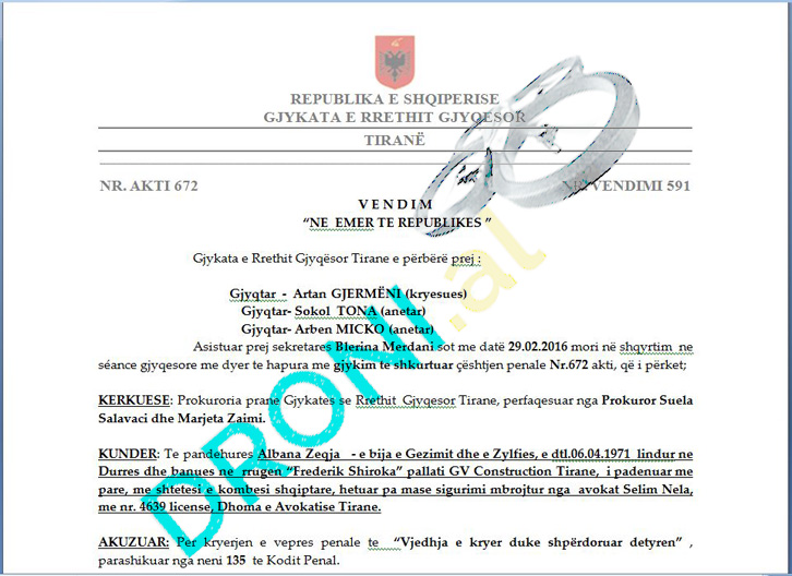 Në përfundim të gjykimit, gjykata e Rrethit Gjyqësor e Tiranës e dënoi Albana Zeqajn, me 3 (tre) vjet burgim. Në zbatim të nenit 406 të Kodit të Procedurës Penale të pandehurës Albana Zeqja i ulet 1/3 e dënimit, duke u dënuar përfundimisht 2 (dy) vjet burgim.