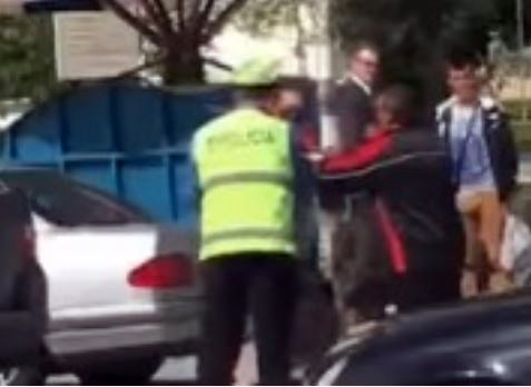 Fatmirësisht qytetari shpëtoi por sikur të mos mjaftonte tronditja e pësuar nga përplasja, shoferi del nga makina dhe fillon të godasë qytetarin në mes të rrugës, mu para syve të një polici rrugor.