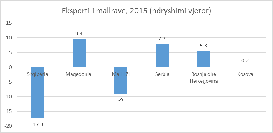 Ecurinë më të mirë në rajon e ka Maqedonia, eksportet e mallrave të së cilës u rritën me 9.4%, me bazë vjetore në 2015-n. Edhe Serbia ka shënuar ecuri pozitive me 7.7%, e ndjekur nga Bosnja me 5.3%.