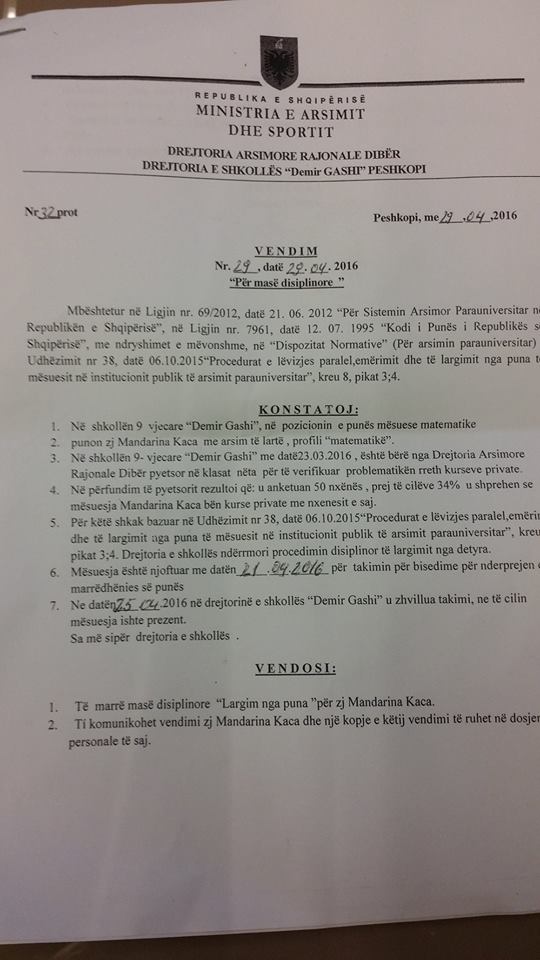 Drejtoria arsimore e Dibrës largoi nga puna mësuesen e matematikës mandarina Kaca pasi mori pjesë në takimin që organizoi Blushi dhe Hafizi në Peshkopi.