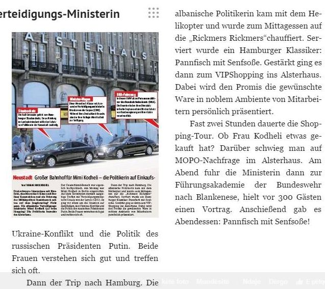 Tabloidi gjerman “Hamburger Morenspost” ndërsa përshkruan vizitën e Mimi Kodhelit në Gjermani ka vazhguar edhe pazarin që ka bërë te Alsterhaus. Ja cafrë shkruan: