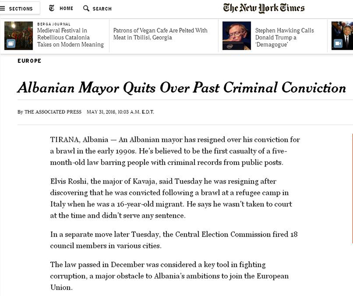 “Besohet të jetë viktima e parë e një ligji të miratuar 5 muaj më parë për bllokimin e personave me precedentë penalë në poste publike. Elvis Roshi, kryebashkiak i Kavajës, tha këtë të martë se jepte dorëheqjen pasi kishte zbuluar se ishte dënuar pas një sherri në një kamp refugjatësh në Itali në moshën 16-vjeçare. Ai tha se nuk ishte dërguar në gjykatë në atë kohë dhe se nuk kishte vuajtur asnjë dënim”, shkruan midis të tjerave “New York Times”.