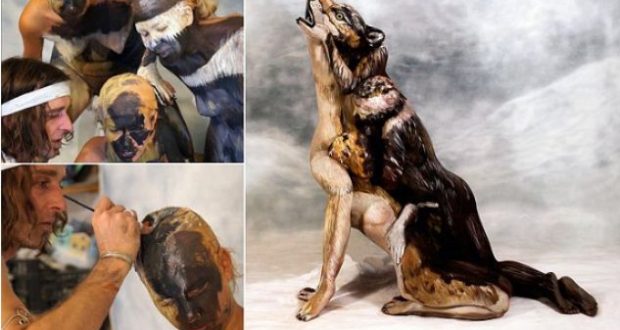 Një piktor trupi ka mahnitur njerëzit me punën e tij të fundit mashtruese për syrin – duke transformuar tri femra të zhveshura në një ujk të mahnitshëm.