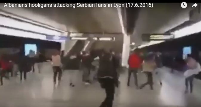 Një video është duke qarkulluar sot në yotube ku shihet një përplasje fizike mes tifozëve shqiptarë dhe atyre serbë në aeroportin e Lionit. Thuhet se dy tifozeritë rastësisht janë takuar në aeroport dhe se rrahja mes tyre ka zgjatur disa minuta, si pasoj disa tifozë kanë përfunduar me lëndime të lehta.