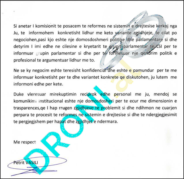 Një gjë e tillë mësohet pas një letre që kryetari i grupit parlamentar të LSI-së, njëherazi edhe anëtari i komisionit të reformës në drejtësi, petrit Vasili, i ka dërguar kryetarit të këtij komisioni, socialistit Fatmir Xhafaj.