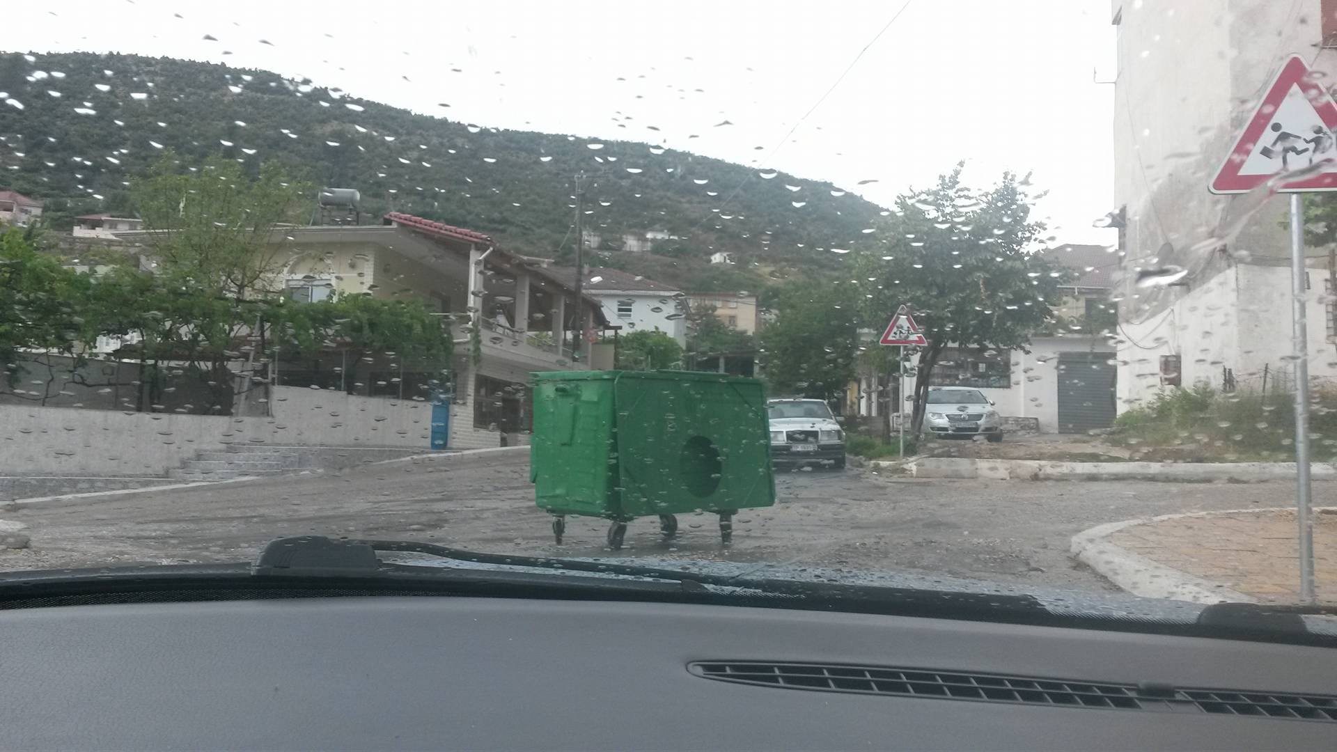 FOTO LAJM/ Investimi i fundit në Tepelenë, por një shi bie i nxjerr në mes të rrugës koshat e mbeturinave