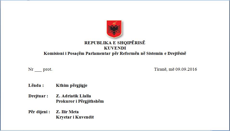 Nr ___ prot. Tiranë, më 09. 09. 2016