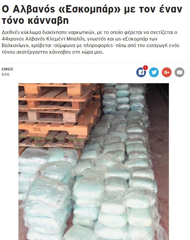 Një nga gazetat më të mëdha ne Greqi, “Ethnos”, shkruan sot se “pas dërgimit në Greqi të ngarkesës prej 1 ton kanabis, eshte një rrjet ndërkombëtar i trafikut të drogës, i lidhur me 44-vjeçarin shqiptar, Klement Balili, që njihet edhe si Eskobar i Ballkanit”. Madje edhe titulli në versionin online të gazetës Ethnos, është: “Eskobari shqiptar me një ton kanabis”.