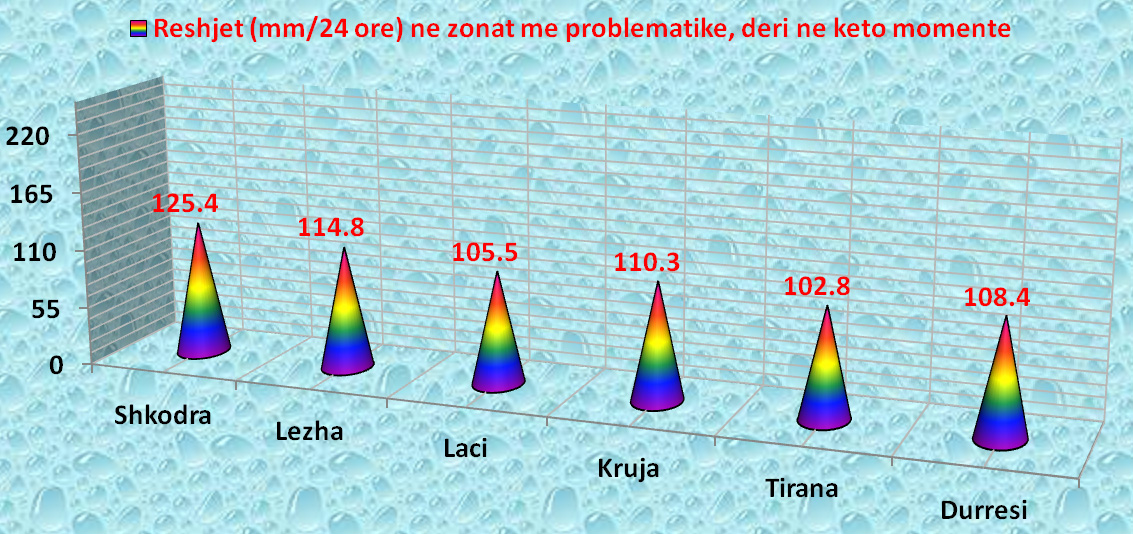 Sipas Meteoalb, mësohet se pas rrebeshit të mëparshëm, Tirana regjistroi nje total prej 103 mm shi në vetëm 5 orë. Kjo sasi, referuar normës mujore të reshjeve të Nëntorit për qytetin e Tiraneës, vlerësohet në masën 63%.