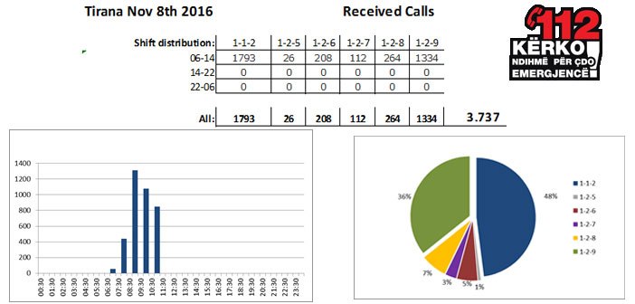 Nisur nga situata e reshjeve të dendura, Salla e Komandimit në Policinë e Tiranës është në gatishmëri të plotë, duke i ardhur në ndihmë qytetarëve për çdo rast emergjence. Në ditë normale, Salla e Komandimit të Policisë së Tiranës, numëron mesatarisht 1200 thirrje telefonike gjatë 24 orëve. Sipas statistikave të gjeneruara nga sistemi i numrit unifikues 112, rezulton se; në datë 8 Tetor 2016, deri në orën 11:30, punonjësit e Sallës së Komandimit, i janë përgjigjur 3737 telefonatave, nga qytetarë të ndryshëm.