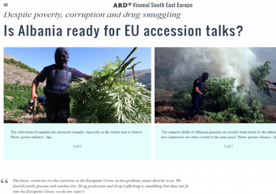 “Prodhimi dhe trafikimi i drogës është diçka që nuk i përshtatet Bashkimit Europian, ne nuk e duam këtë. BE-ja është shpresa e së ardhmes për shumicën e shqiptarëve. Shqipëria ‘eksporton’ vetëm marijuanë në përmasa të mëdha, por është gjithashtu rrugë kryesore e trafikut të kokainës nga Amerika Jugore dhe heroinës nga Afganistani. Korrupsioni i vazhdueshëm, mungesa e pavarësisë së gjyqtarëve dhe migrimi i popullsisë janë gjithashtu çështje që shqetësojnë Berlinin dhe Brukselin”, raporton televizioni kombëtar gjerman.