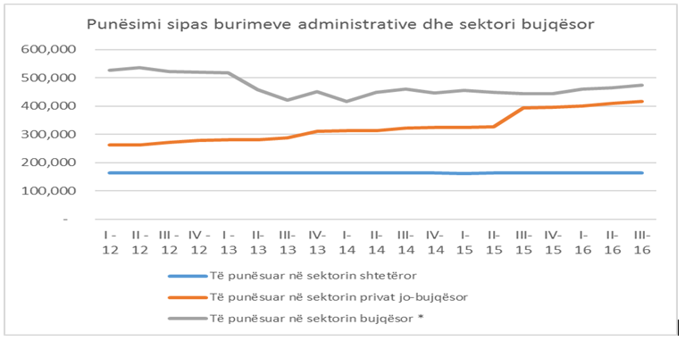 Në tabelën e INSTAT “Punësimi sipas burimeve administrative dhe sektori bujqësor raporton të dhënat administrative për të punësuarit në sektorin shtetëror dhe atë privat jo bujqësor (sipas raportimeve zyrtare te sigurimet), ndërsa për bujqësinë të dhënat merren nga Anketa e Forcave të Punës (vrojtimi në terren, ku njerëzit pyesin nëse kanë punuar apo jo).
