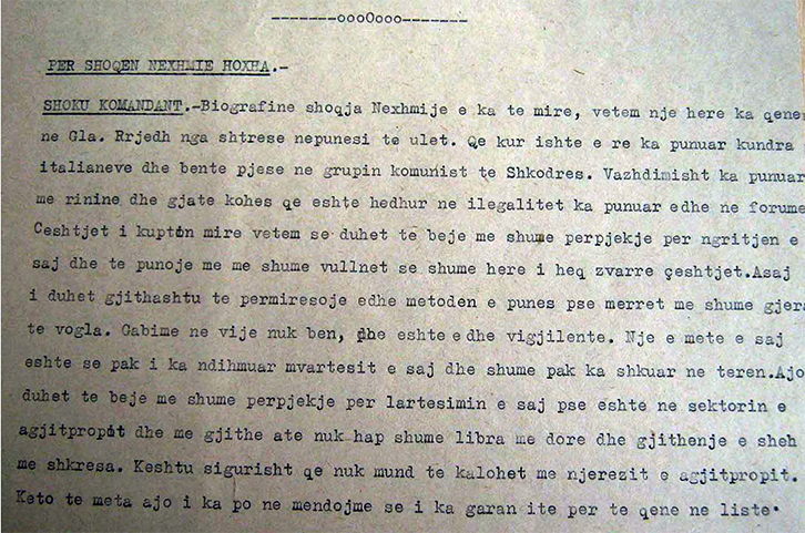 “Biografinë, shoqja Nexhmije e ka të mirë, vetëm një herë ka qenë në GLA. Rrjedh nga shtresë nëpunësi të ulët. Që kur ishte e re ka punuar kundra italianëve dhe bënte pjesë në grupin komunist të Shkodrës. Vazhdimisht ka punuar me rininë dhe gjatë kohës që është hedhur në ilegalitet ka punuar edhe në forume. Çështjet i kupton mirë, vetëm se duhet të bëjë më shumë përpjekje për ngritjen e saj dhe të punojë me më shumë vullnet se shumë herë i heq zvarrë çështjet. Asaj i duhet gjithashtu të përmirësojë edhe metodën e punës pse merret me shumë gjëra të vogla. Gabime në vijë nuk bën pse është edhe vigjilente. Një e metë e saj është se pak i ka ndihmuar vartësit e saj dhe shumë pak ka shkuar në terren. Ajo duhet të bëjë më shumë përpjekje për lartësimin e saj pse është në sektorin e agjitpropit dhe megjithatë dhe megjithatë nuk hap shumë libra me dorë dhe gjithnjë e sheh me shkresa. Kështu sigurisht që nuk mund të kalohet me njerëzit e agjitpropit. Këto të meta, ajo i ka, po ne mendojmë se i ka garancitë për të qenë në listë”.