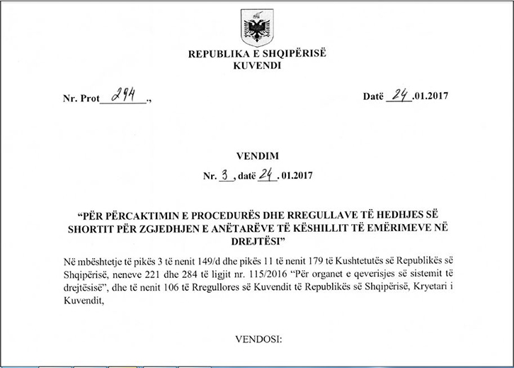 vendimin nr. 3, datë 24. 01. 2017, Kryetari i Kuvendit ka miratuar rregullat dhe procedurën e hedhjes së shortit për zgjedhjen e anëtarëve të Këshillit të Emërimeve në Drejtësi.