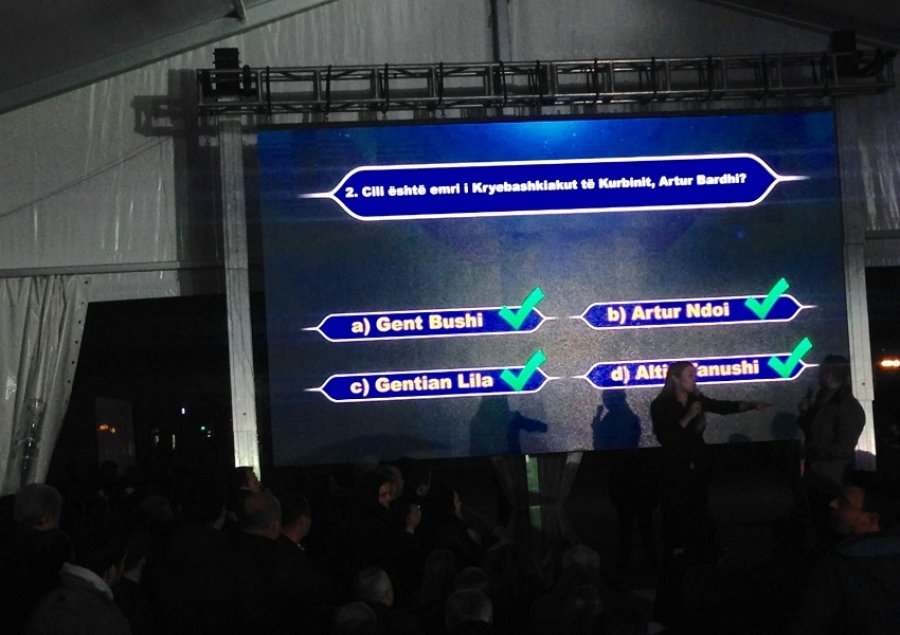 Në monitorin e madh që ndodhet brenda “çadrës së lirisë” përballë godinës së Kryeministrisë, anëtarë të Partisë Demokratike shfaqën disa pyetje në formë pyetësori për të gjetur përgjigjen e saktë.