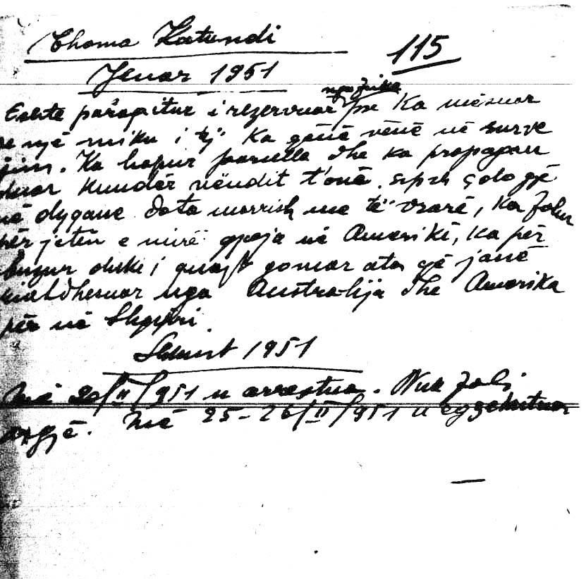 Në dosje është ky shënim: “Është paraqitur i rezervuar nga frika pse ka mësuar se një miku i tij ka qenë nën survejim. Ka hapur parulla dhe ka propaganduar kundër vendit tonë sepse çdo gjë në dyqane do ta marrësh me të vrarë (me radhë d.m.th. – shënim). Ka folur për jetën e mirë gjoja në Amerikë, ka përbuzur duke i quajtur gomarë ata që janë riatdhesuar nga Australia dhe Amerika në Shqipëri. U arrestua më 20. 02. 1951. Nuk foli asgjë. Më 25-26 shkurt 1951 u ekzekutua”.