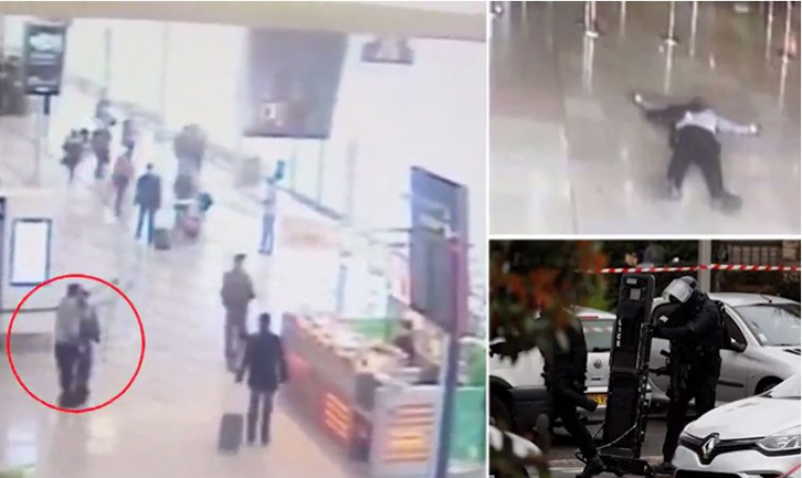 Pamjet e kamerës së sigurisë së aeroportit Orly të Parisit shfaqin momenti kur ekstremisti islamik sulmoi të shtunën nga mbrapa një oficere femër në aeroportin përpara se t’i merrte armën.