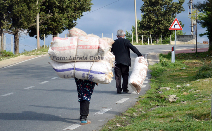 “Një grua e lidhur në kurriz me katër thasë shtroje për bagëtinë, udhëhiqet nga bashkëshorti i saj teksa kthehen për në shtëpi në zonën e Dajtit, 7 kilometra nga qendra e Tiranës. 18 prill 2017. Cilësuar si një skenat më të zakonshme të pabarazisë gjinore në zonat periferike, pamje të tilla vazhdojnë të ilustrojnë punën e papaguar të grave në Shqipëri.