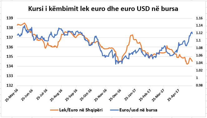 Grafiku “Kursi i këmbimit lek-euro dhe euro-USD në bursa” tregon qartë se në prill-maj të këtij viti, kursi në vend ka ecur në të kundërt të bursës ndërkombëtare, çka tregon se janë faktorët e brendshëm ata që po përcaktojnë forcimin e lekut dhe rënien e euros.