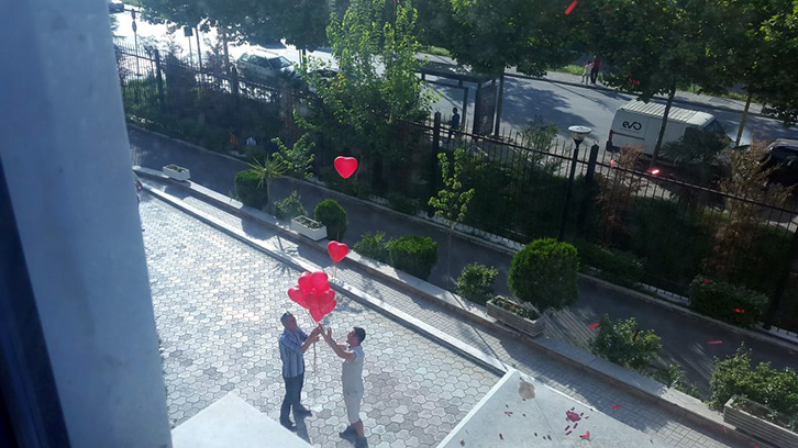 Të pranishmit në ambientet e këtij materniteti janë bërë dëshmitarë të një skene shumë të bukur, ku babai i ri ka sjellë një tufë të madhe tullumbace të kuqe në formë zemre, të cilat i ka lëshuar në ajër, ndërsa e shoqja e përshëndeste nga dritarja gjithë këtë skenë.