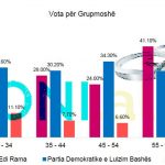 Partia Demokratike ka përparësi mes të rinjve të moshës 18–34 vjeç, ndërsa votuesit më të shumë të Partisë Socialiste janë mbi 55 vjeç. LSI ka përparësinë më të madhe të saj në elektoratin e përbërë nga grupmosha 23 – 44 vjeç dominuar nga grupmosha 23 – 34 vjeç.