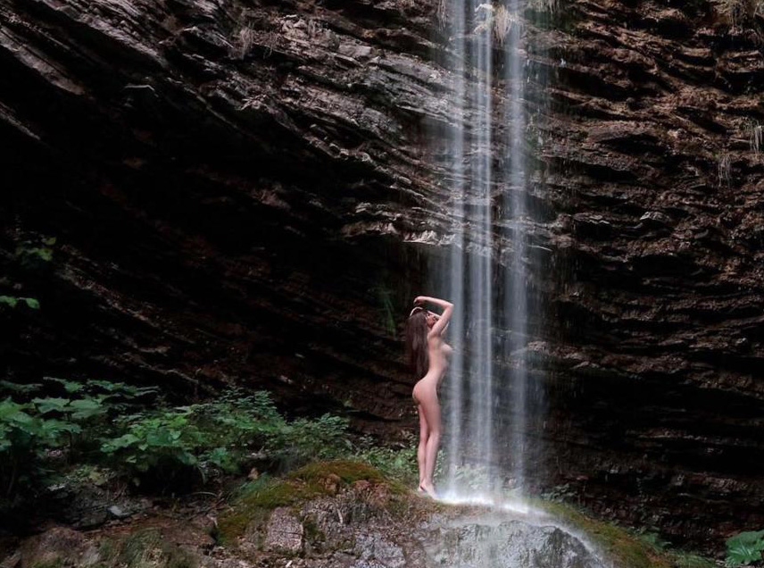 Burkuroshja ruse, u zhvesh para aparatit për një seri fotosh artistike në një pyll duke treguar linjat e saj trupore.