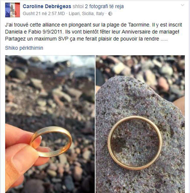 Kur e gjeti këtë unazë në plazhin e Taorminës, Caroline Debregas, një turiste franceze me pushime në Sicili, menjëherë ka menduar të gjejë pronarin e ligjshëm. Falë “Facebook”-ut dhe në bashkëpunim me shumë njerëz, postimi i saj u bë viral duke arritur kështu të gjejë pronarin e vërtetë dhe ti dorëzojë unazën.