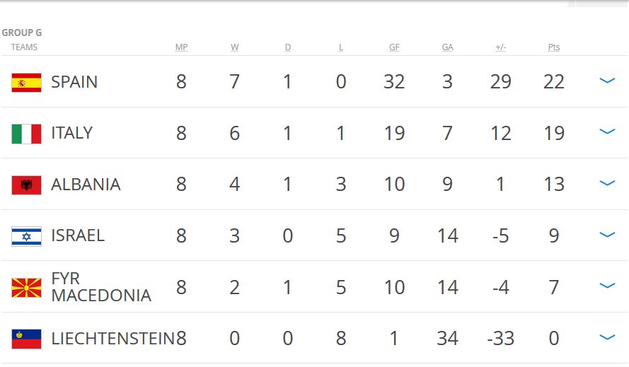 Me ndeshjen e sotme, Shqipëria ngjitet në kuotën e 13 pikëve në Grupin G, dhe pas dy ndeshjeve të mbetura, mbetet në vendin e tretë. DRONI.al